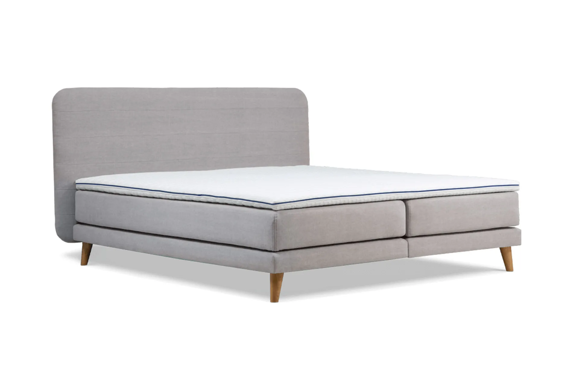 Harmonisches Boxspringbett mit sanft abgerundeten Ecken und horizontalen Ziernähten.