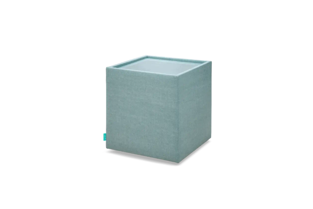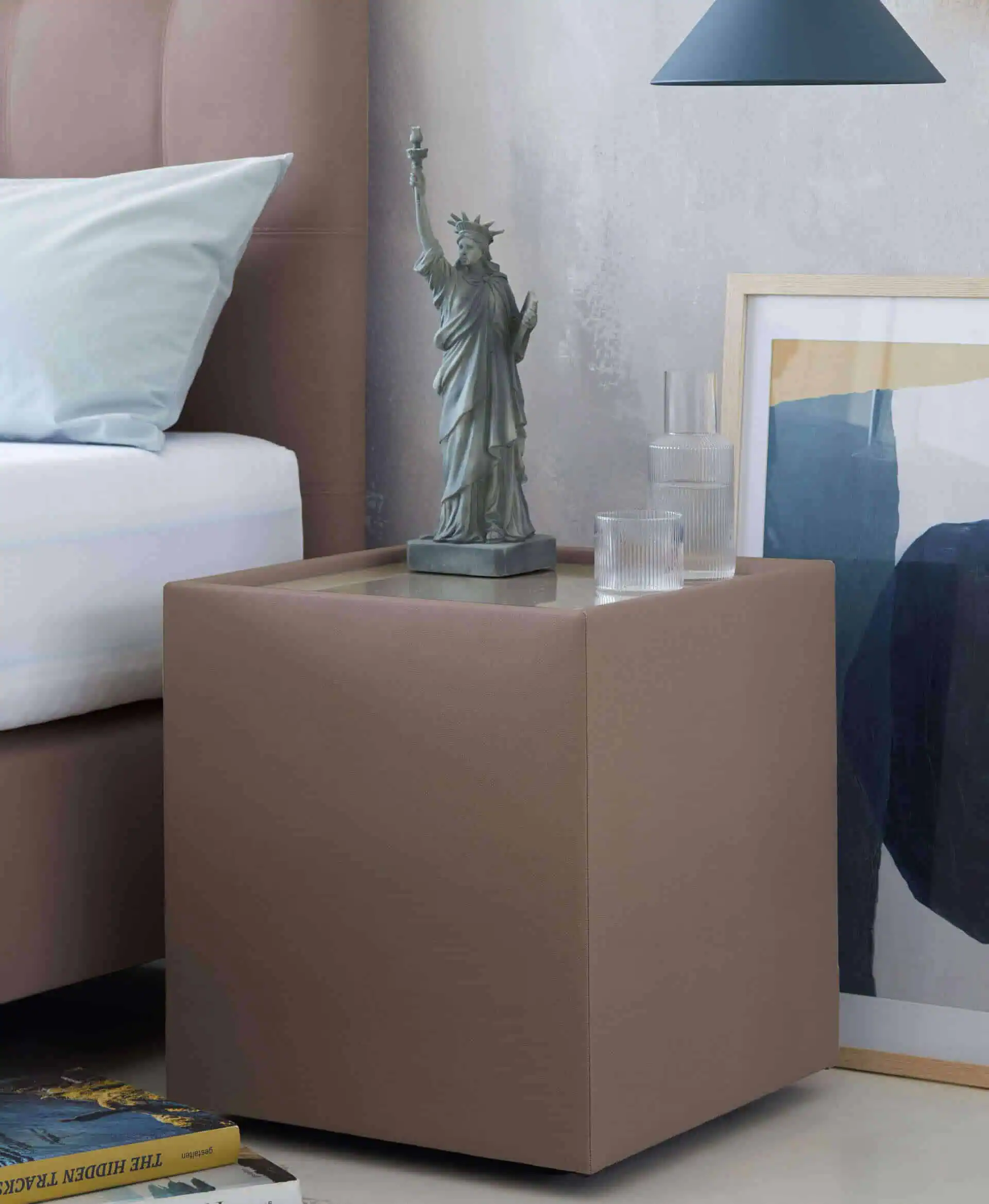 Stoffbezogener Nachttisch mit Glasplatte. Für alles rund um das Bett.