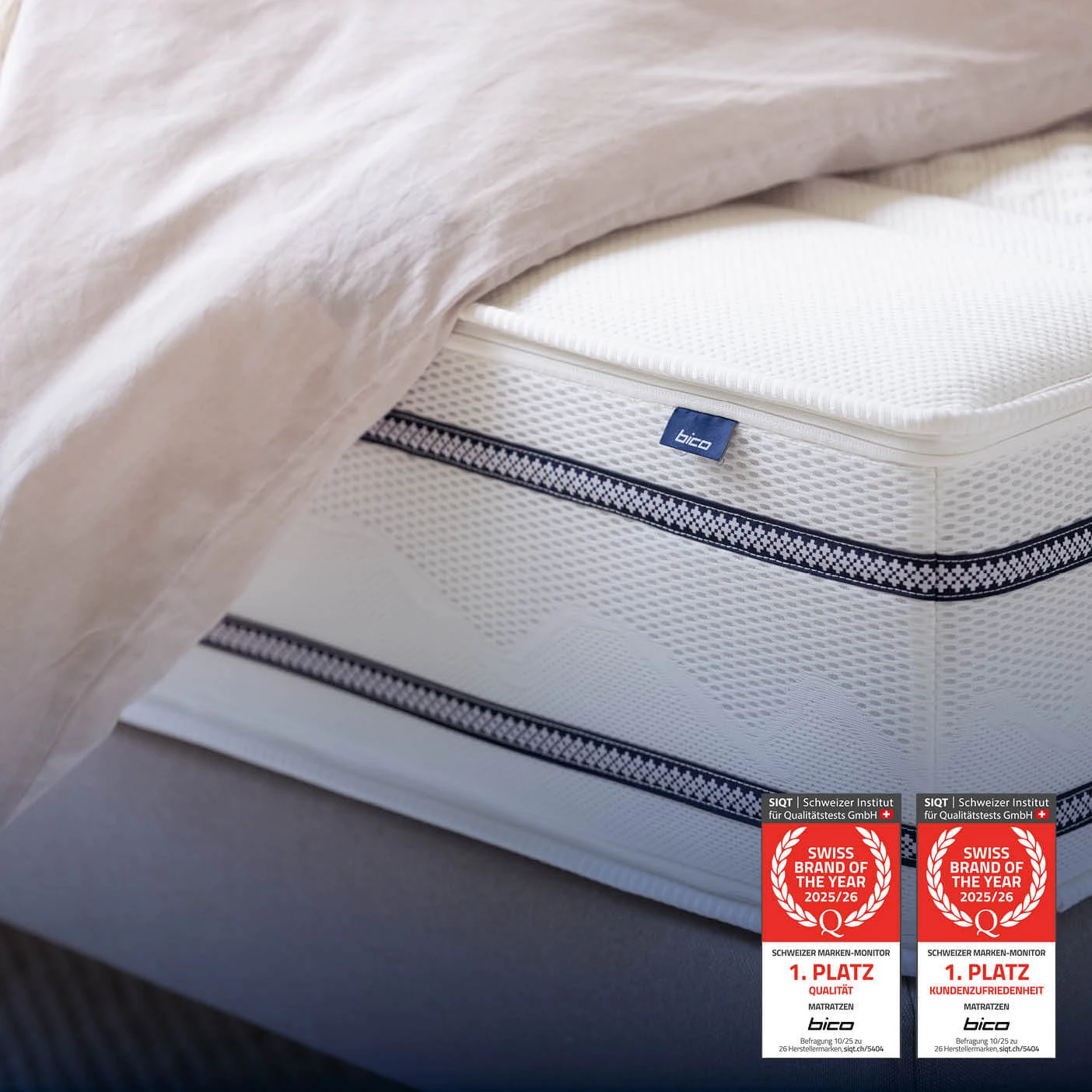 Das ist unser Anspruch für die ganze Schweiz. Unsere Besonderheit: differenzierter Schlafkomfort, bei dem sich modernste Matratzen-Technologie, Swissness, Qualität und Nachhaltigkeit vereinen. Umso mehr freuen wir uns, bereits mehrere Jahre in Folge über die Auszeichnung als «Schweizer Marke des Jahres 2025/26», bei der wir in den Kategorien «Qualität» und «Zufriedenheit» als Testsieger gekürt wurden. Für uns die Bestätigung, dass wir seit 1861 kontinuierlich den richtigen Weg gehen. Überzeugen Sie sich selbst. Denn was uns noch wichtiger ist als diese Auszeichnung: Ihre Gesundheit und Ihr erholsamer Schlaf.