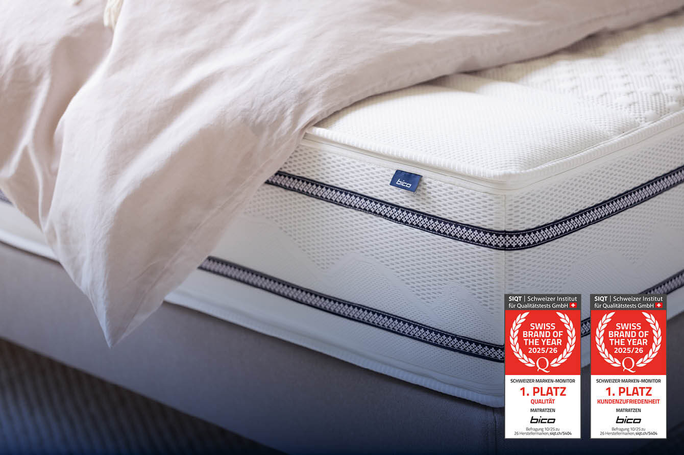 Für ä tüüfä gsundä Schlaaf.® Das ist unser Anspruch für die ganze Schweiz. Umso schöner ist es, wenn mehr als 150’000 KundInnen uns die Bestnote verleihen. Bereits seit mehreren Jahren in Folge gelangte BICO in der unabhängigen Studie SWISS BRAND OF THE YEAR in den Kategorien «Kundenzufriedenheit» und «Qualität» auf den 1. Platz und ist damit wiederholt «Schweizer Marke des Jahres». Für uns die Bestätigung, dass wir seit 1861 den richtigen Weg gehen. Denn was uns noch wichtiger ist als diese Auszeichnung: Ihre Gesundheit und Ihr erholsamer Schlaf.